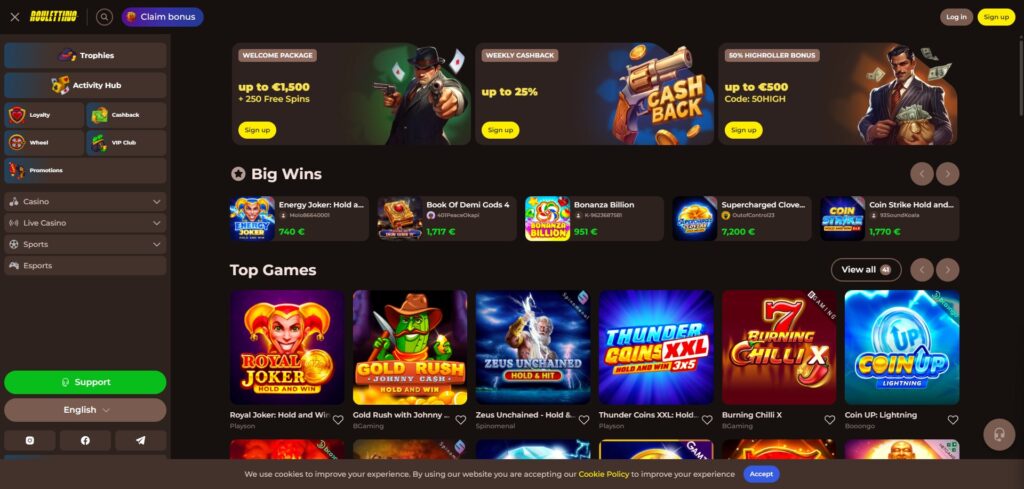 Roulettino propose un bonus sans dépôt attractif : 50 Free Spins offerts après inscription avec le code promo BARKMT. Ce bonus cible cinq jeux populaires, dont Big Bass Bonanza et Book of Dead, laissant le joueur choisir sa machine préférée.
