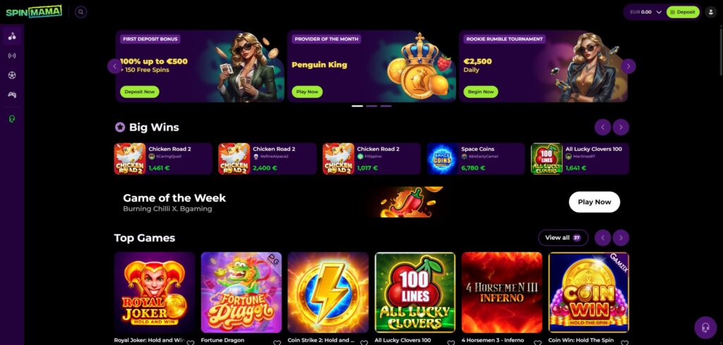 Spinmama, opéré par Uno Digital Media sous licence Curaçao, propose plus de 6 000 jeux. À noter : l’offre est inaccessible aux joueurs belges et soumise à des restrictions géographiques.
